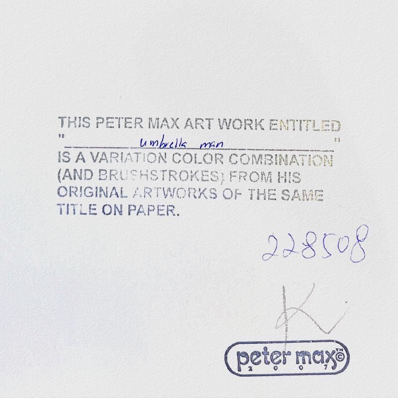 "Umbrella Man on Blends" is a one-of-a-kind acrylic mixed media on paper, hand signed by Peter Max. The piece comes custom framed with a backside cutout to display Peter Max Studio registration number 228508 certifying authenticity. Measures approximately 24" x 22" (frame), 10" x 8" (image).