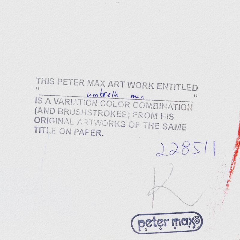 "Umbrella Man on Blends" is a one-of-a-kind acrylic mixed media on paper, hand signed by Peter Max. The piece comes custom framed with a backside cutout to display Peter Max Studio registration number 228511 certifying authenticity. Measures approximately 24" x 22" (frame), 10" x 8" (image).