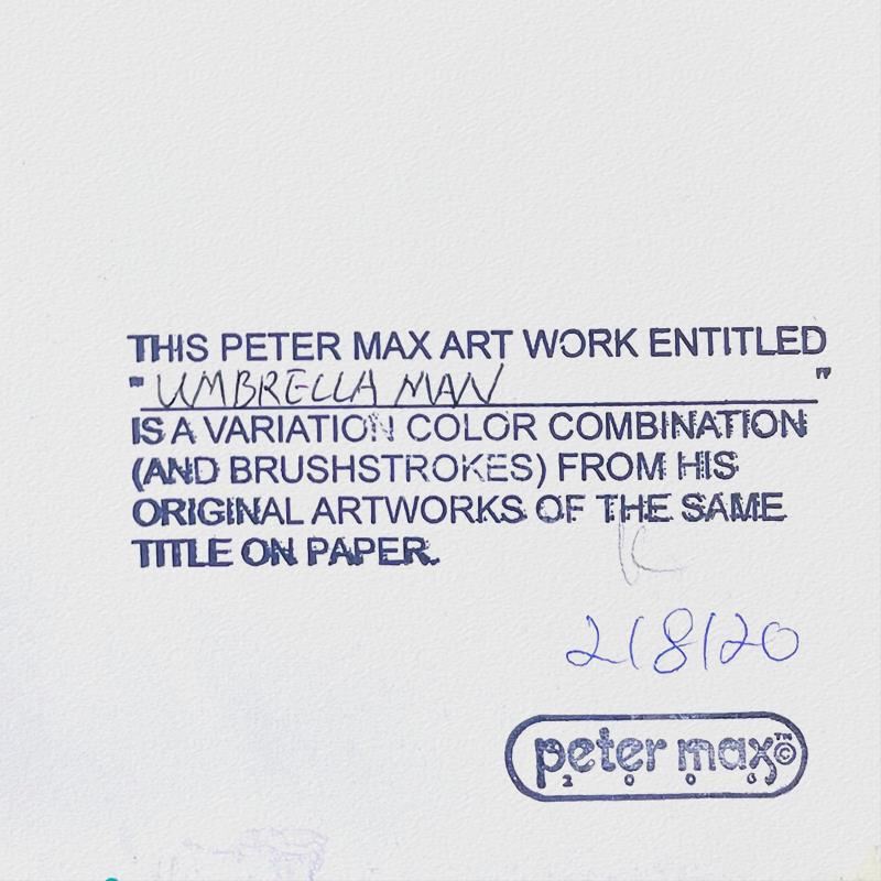 "Umbrella Man on Blends" is a one-of-a-kind acrylic mixed media on paper, hand signed by Peter Max. The piece comes custom framed with a backside cutout to display Peter Max Studio registration number 218120 certifying authenticity. Measures approximately 24" x 22" (frame), 10" x 8" (image). This item requires special handling and may have a longer than usual turnaround.