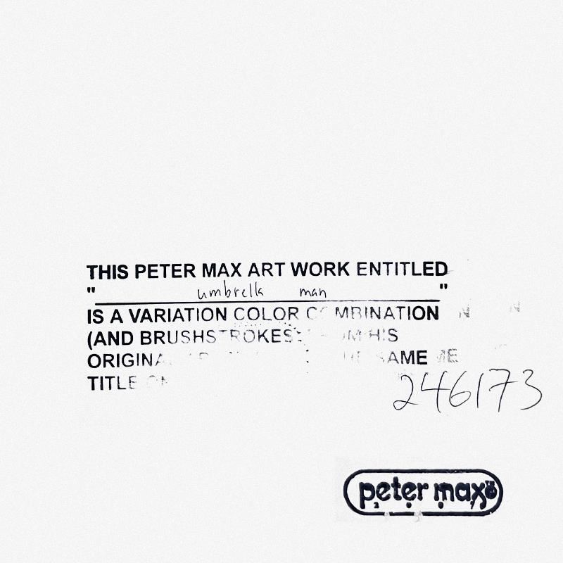 "Umbrella Man on Blends" is a one-of-a-kind acrylic mixed media on paper, hand signed by Peter Max. The piece comes custom framed with a backside cutout to display Peter Max Studio registration number 246173 certifying authenticity. Measures approx. 23" x 21" (frame), 10" x 8" (image). This item requires special handling and may have a longer than usual turnaround.