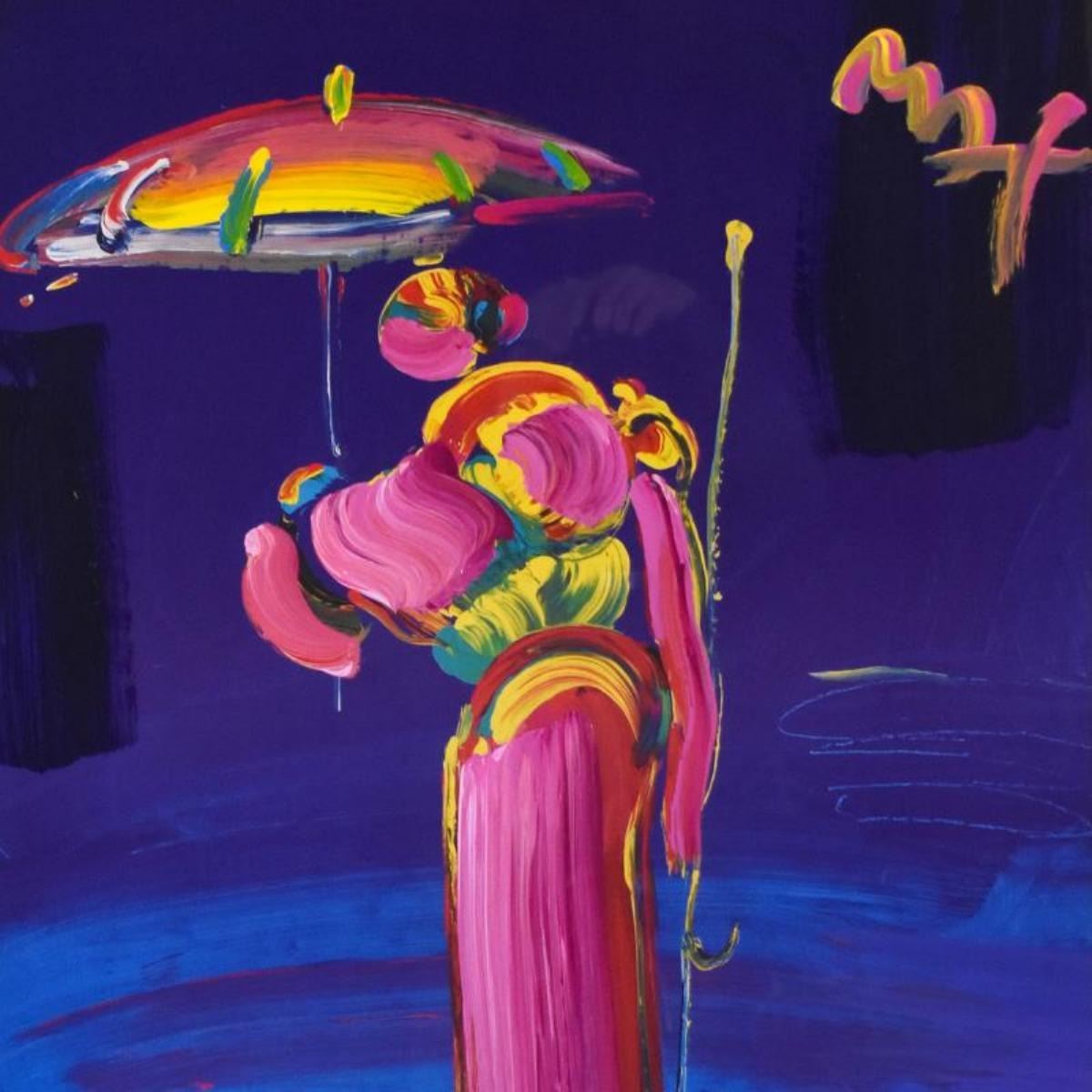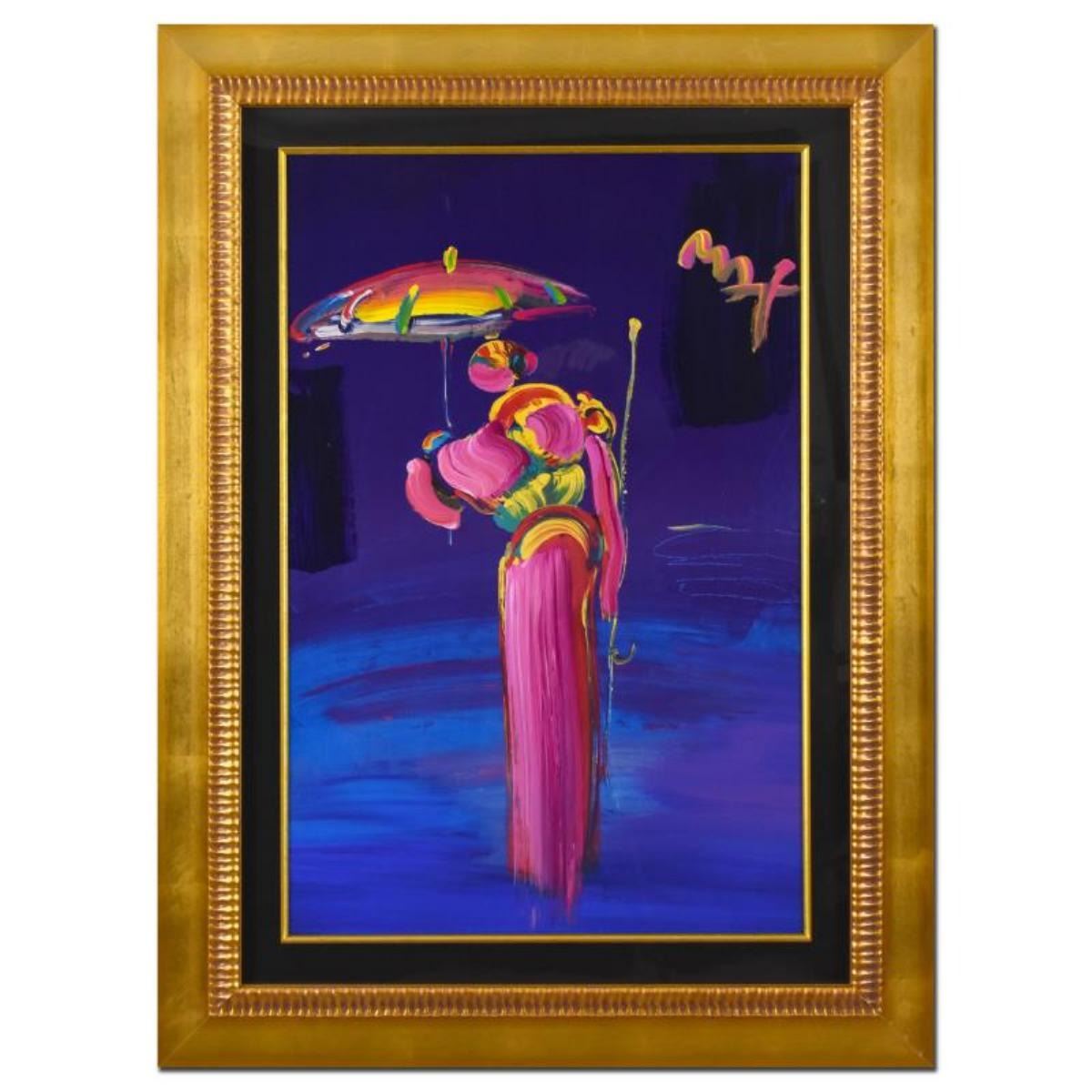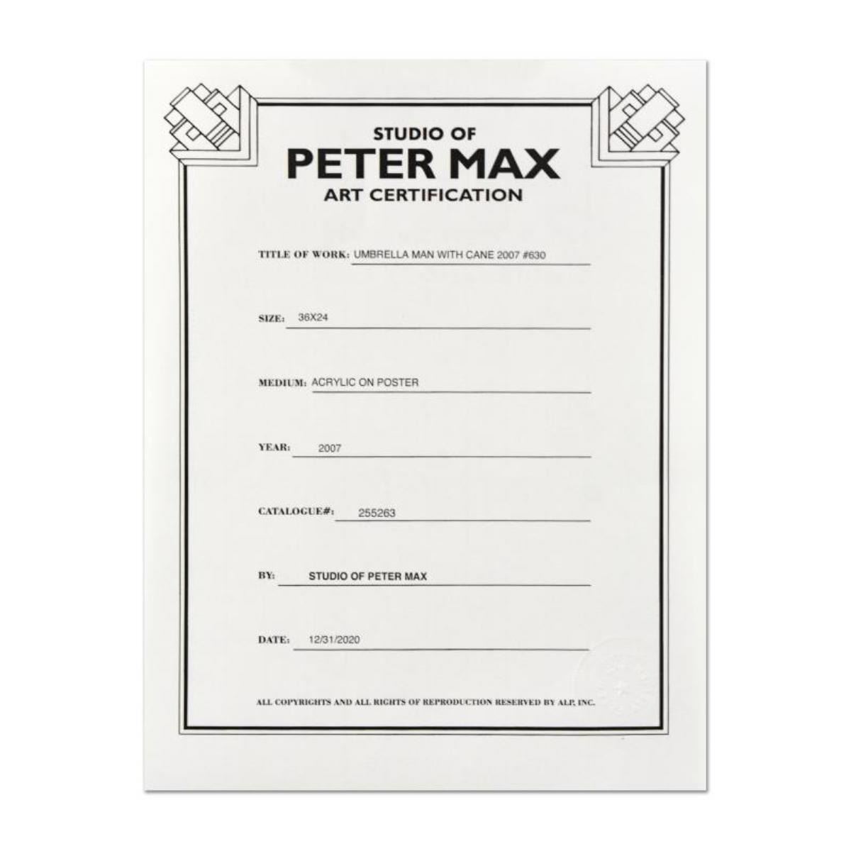 "Umbrella Man with Cane" is a one-of-a-kind acrylic mixed media on paper, hand signed by Peter Max. This piece comes framed. Includes Certificate of Authenticity from Peter Max Studios. Measures approx. 35" x 47" (with frame), 23" x 35" (image). Please note: This piece was newly custom framed, but has a couple very minor nicks from transportation.
