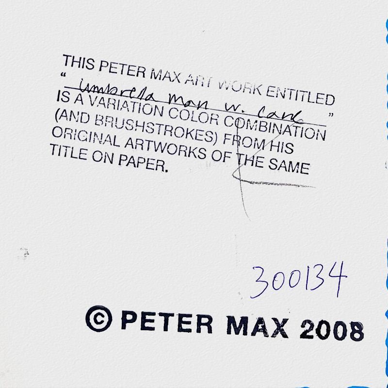 "Umbrella Man with Cane" is a hand signed one-of-a-kind acrylic mixed media on paper by Peter Max. The piece comes custom framed with a backside cutout to display Peter Max Studio registration number 300134 certifying authenticity. Measures approximately 26" x 23" (frame), 13" x 10" (image). This item requires special handling and may have a longer than usual turnaround.