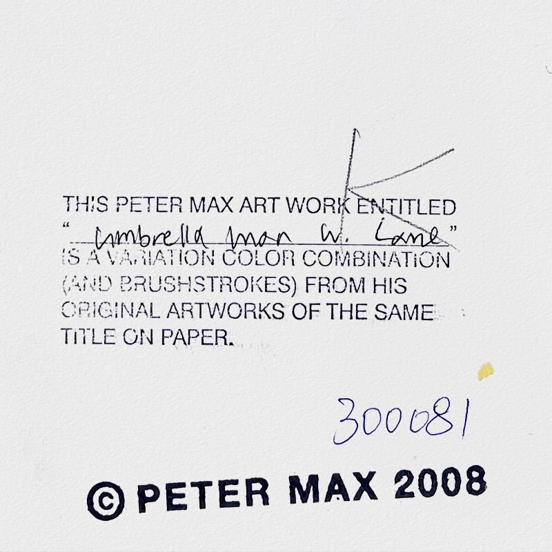 "Umbrella Man with Cane" is a hand signed one-of-a-kind acrylic mixed media on paper by Peter Max. The piece comes custom framed with a backside cutout to display Peter Max Studio registration number 300081 certifying authenticity. Measures approximately 26" x 23" (frame), 13" x 10" (image). This item requires special handling and may have a longer than usual turnaround.