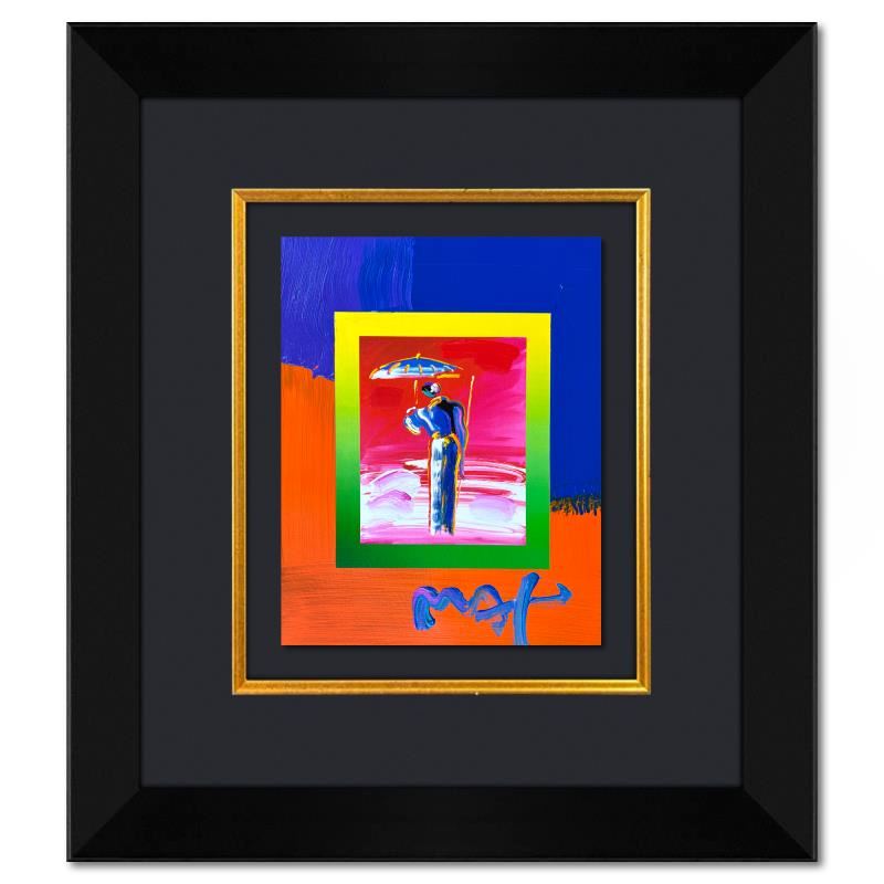 "Umbrella Man with Cane" is a hand signed one-of-a-kind acrylic mixed media on paper by Peter Max. The piece comes custom framed with a backside cutout to display Peter Max Studio registration number 300081 certifying authenticity. Measures approximately 26" x 23" (frame), 13" x 10" (image). This item requires special handling and may have a longer than usual turnaround.