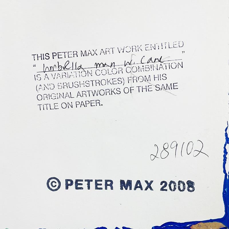 "Umbrella Man with Cane" is a one-of-a-kind acrylic mixed media on paper, hand signed by Peter Max. The piece comes custom framed with a backside cutout to display Peter Max Studio registration number 289102 certifying authenticity. Measures approx. 26" x 23" (frame), 13" x 10" (image). This item requires special handling and may have a longer than usual turnaround.