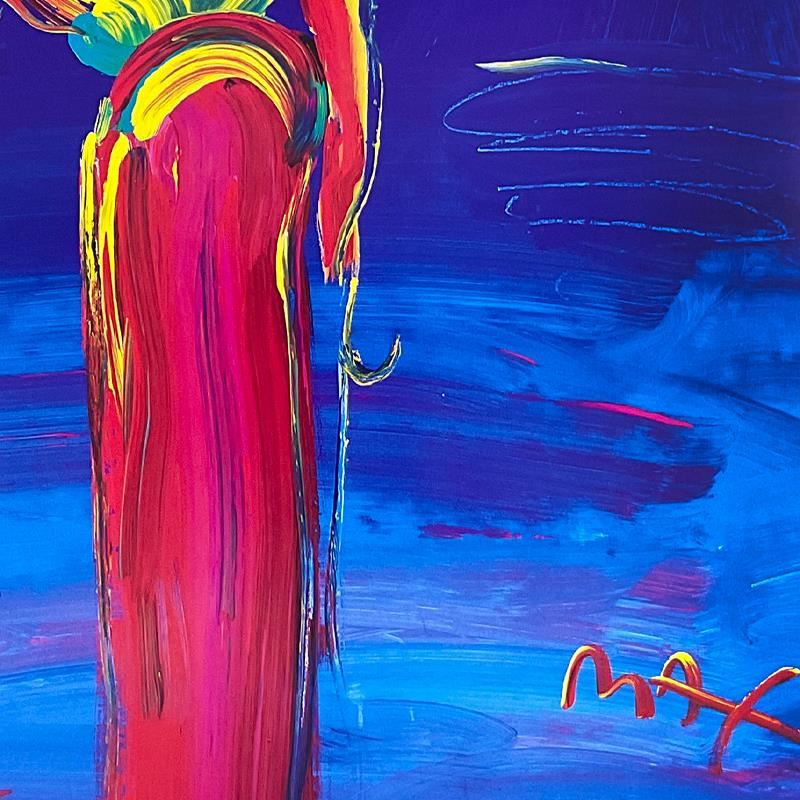 "Umbrella Man with Cane" is an offset lithograph on paper by Peter Max hand signed by the artist. This piece comes custom framed. Includes Letter of Authenticity. Measures approx. 37.5" x 27" (frame) 33.5" x 23" (image).