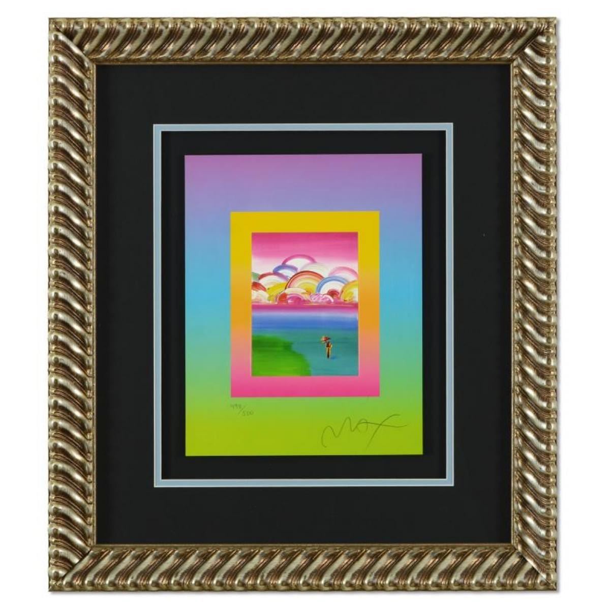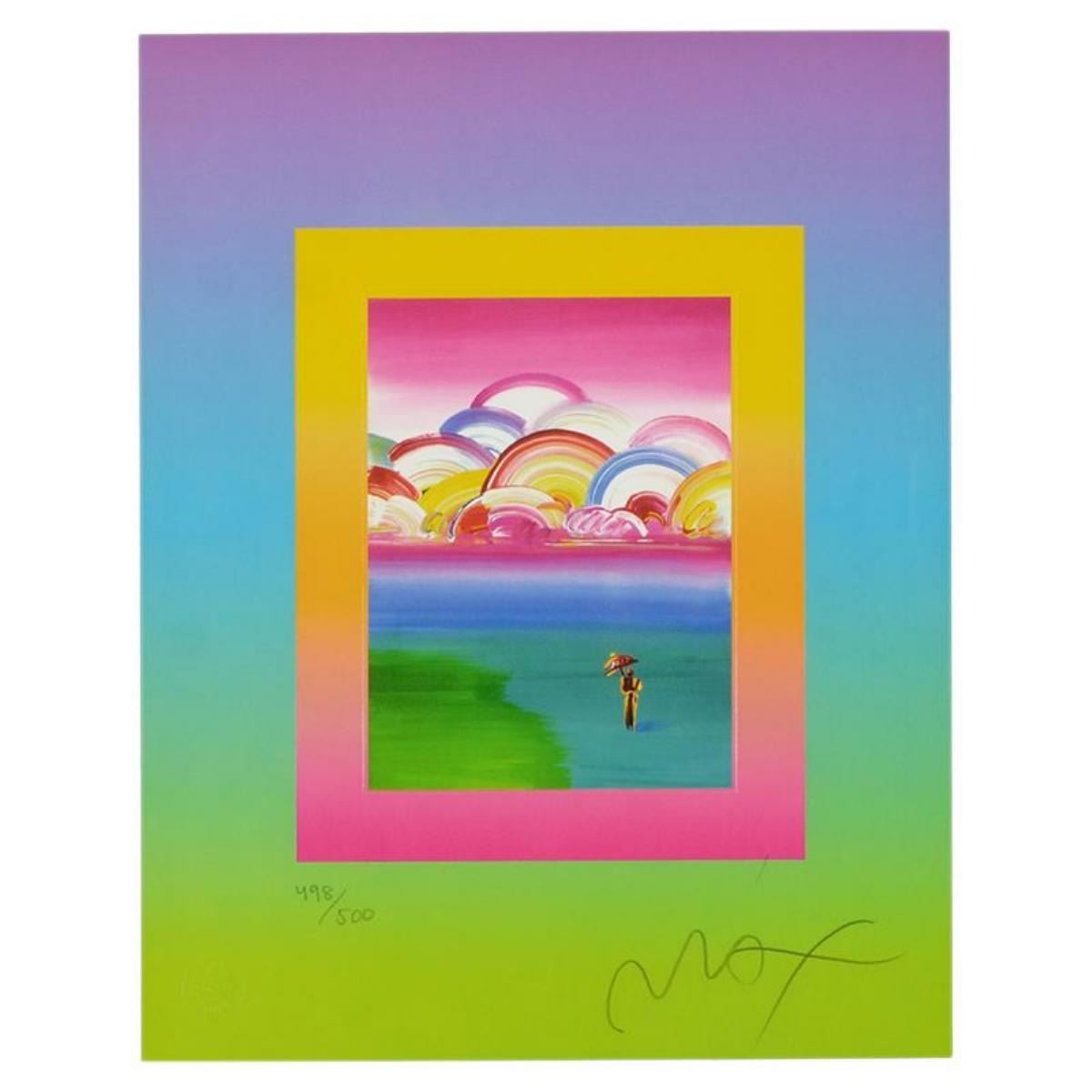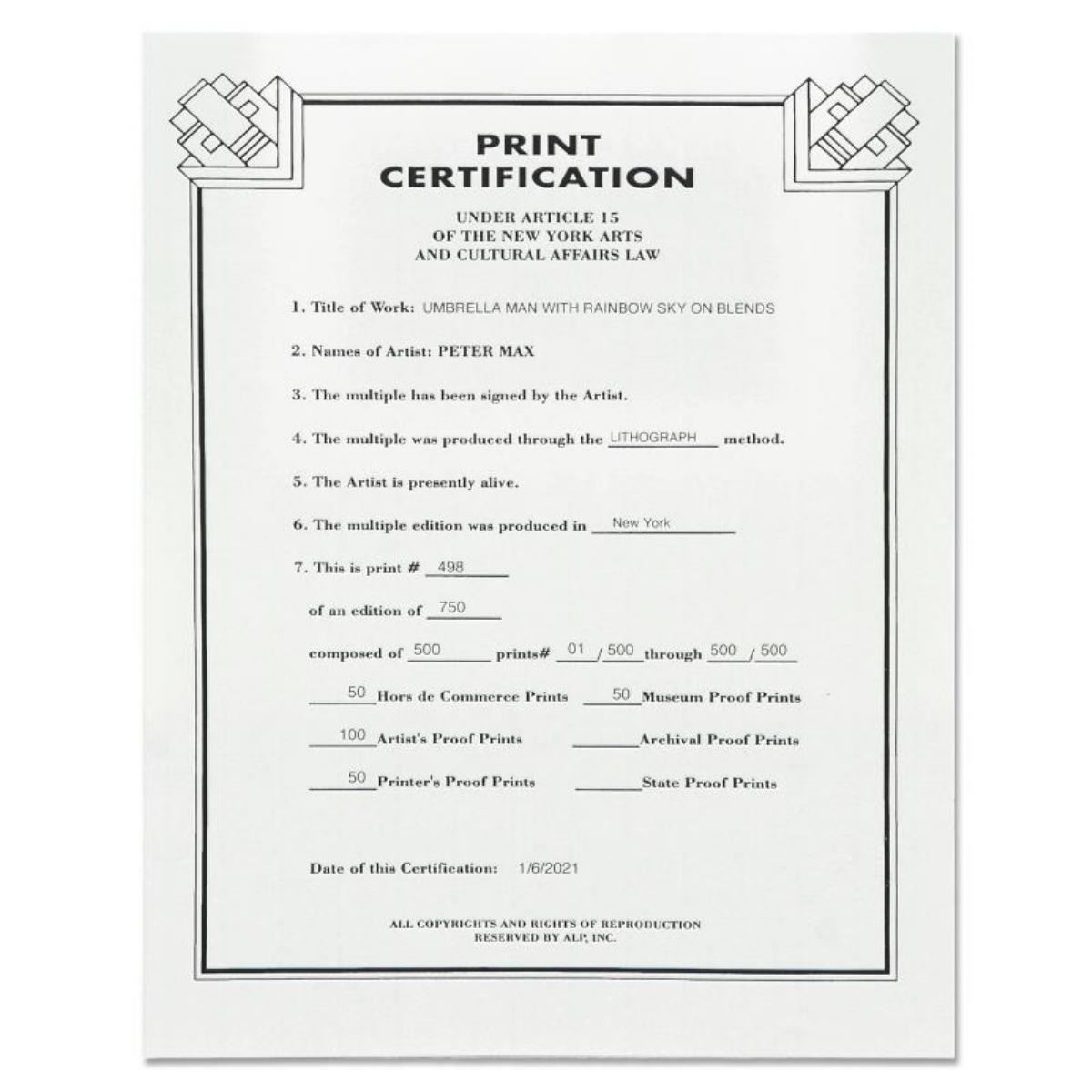 Umbrella Man with Rainbow Sky on Blends by Peter Max. "Umbrella Man with Rainbow Sky on Blends" is a limited edition lithograph on paper by Peter Max, numbered 498/500 and hand signed by the artist. This piece comes framed. Includes Certificate of Authenticity from Peter Max Studios. Measures approximately 21.5" x 24" (frame), 10" x 13" (image).