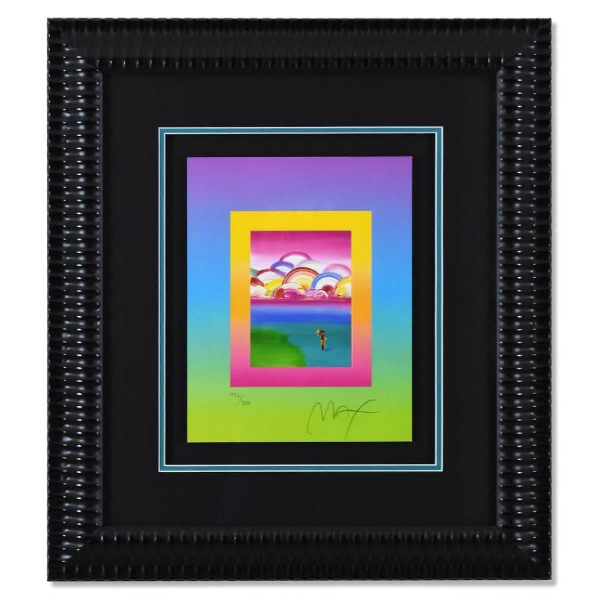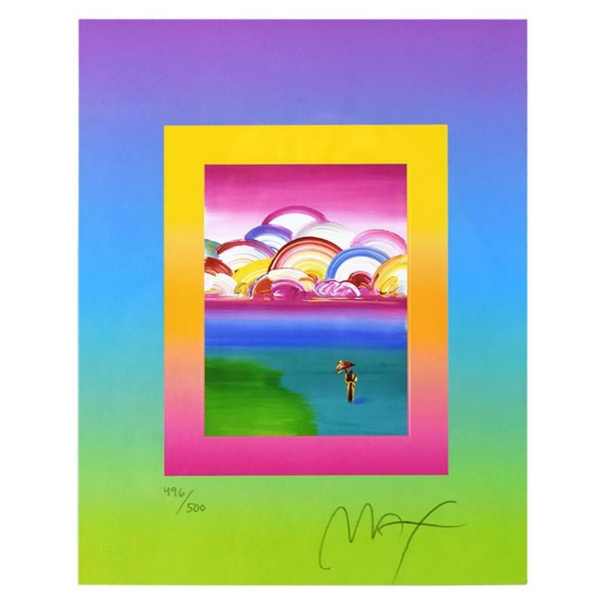 "Umbrella Man with Rainbow Sky on Blends" is a limited edition lithograph on paper by Peter Max, numbered 496/500 and hand signed by the artist. This piece comes framed and includes Certificate of Authenticity from Peter Max Studios. Measures approximately 25.5" x 22.5 (frame), 13" x 10" (image).