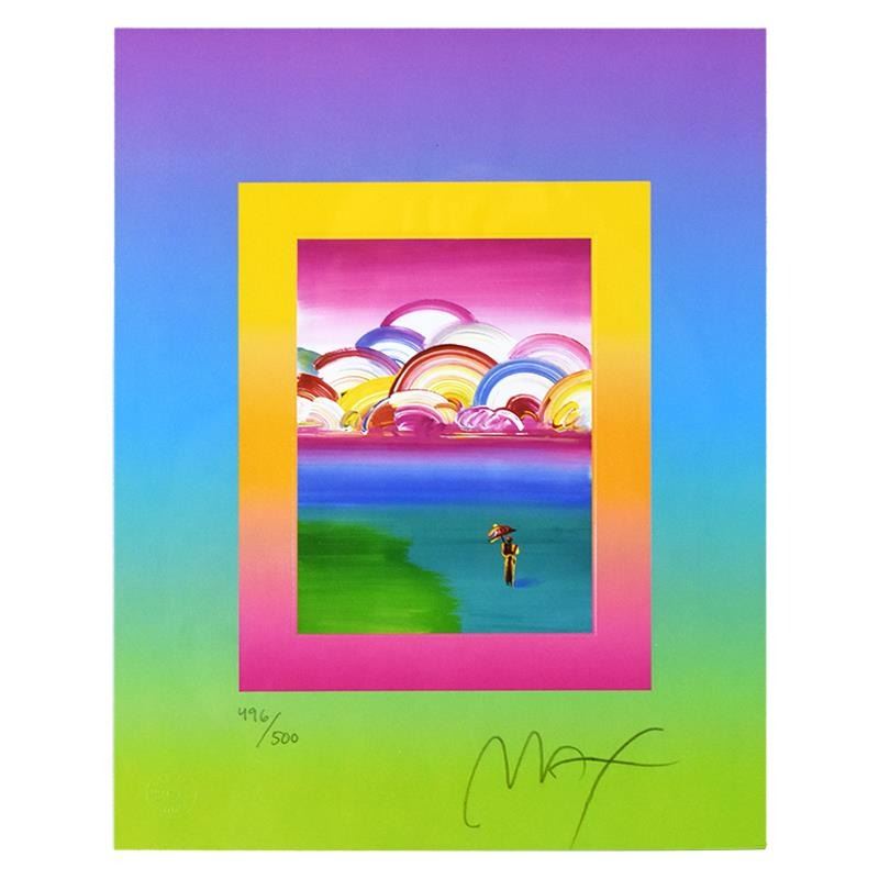 "Umbrella Man with Rainbow Sky on Blends" is a limited edition lithograph on paper by Peter Max, numbered 496/500 and hand signed by the artist. This piece comes framed and includes Certificate of Authenticity from Peter Max Studios. Measures approximatel