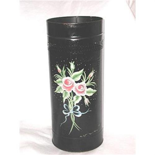 Metal C.1920 black umbrella stand has hand painted center floral design in pink open roses and buds with green leaves and stems tied with a blue ribbon. White dots surround the painting. Open foliate top design to allow drying of the umbrellas. Minor scratches to the black background,otherwise excellent condition. Measures 21H X 9W.