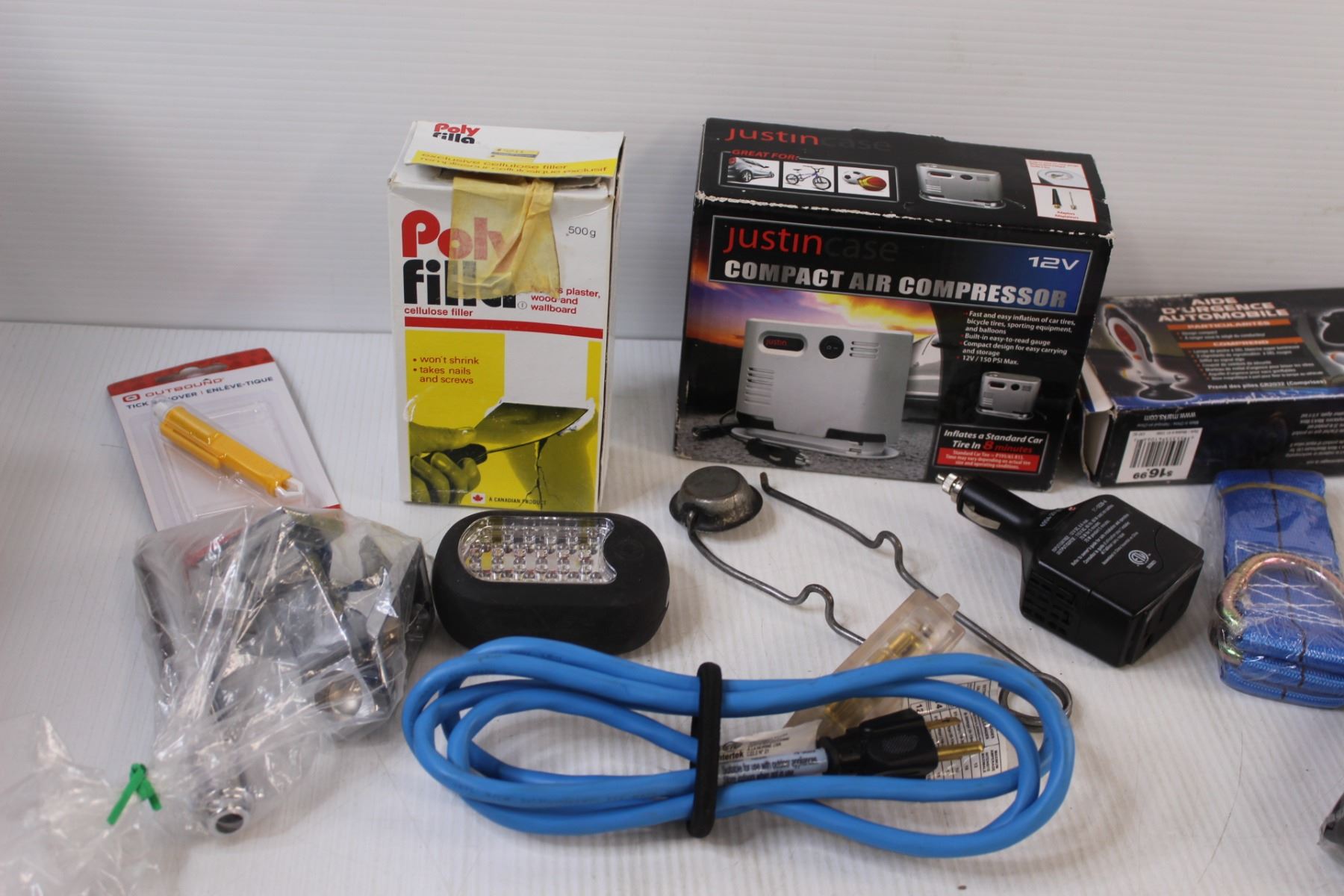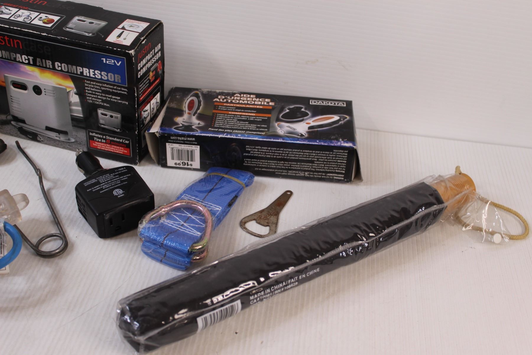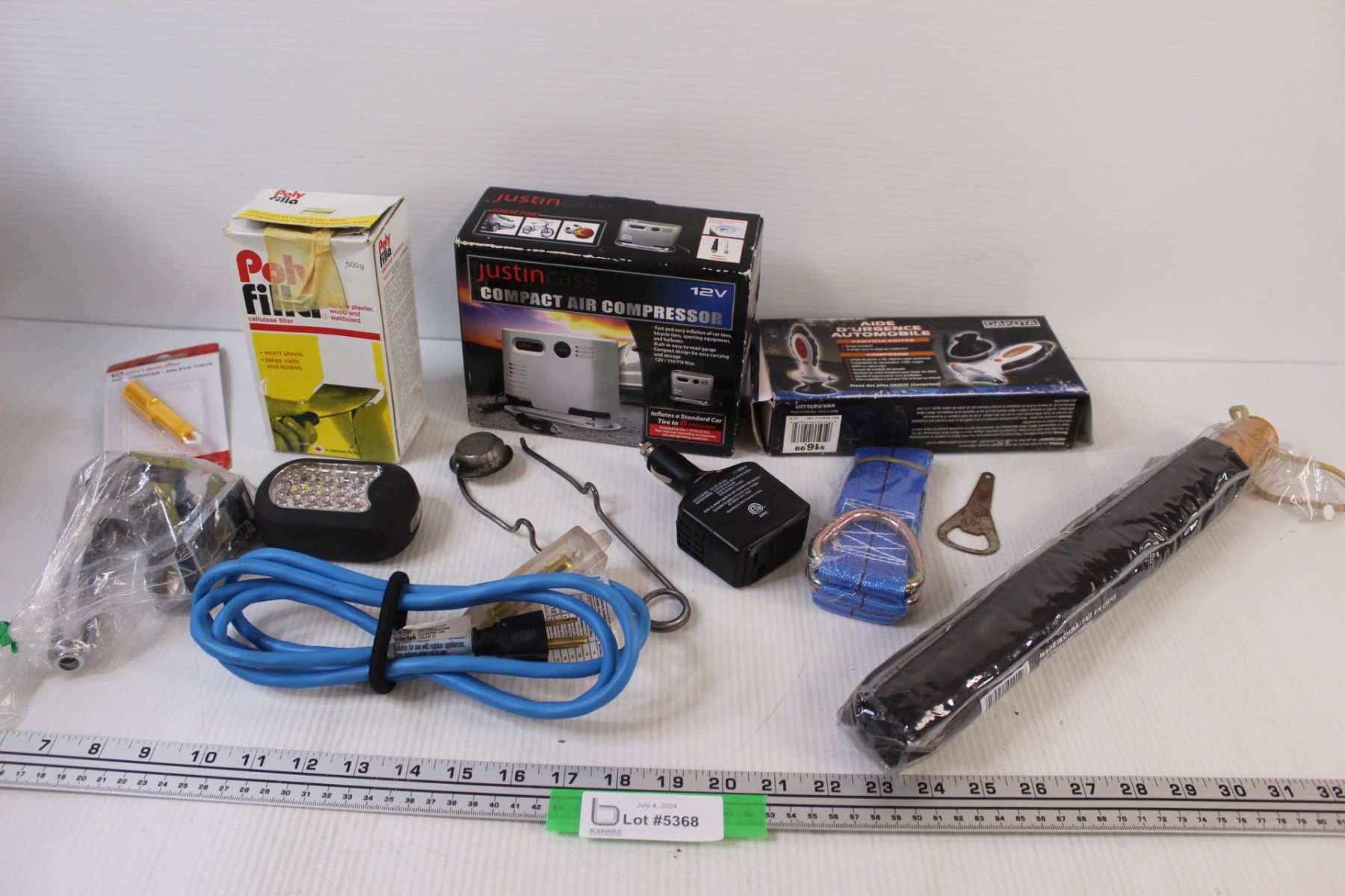Umbrella, Tick Remover, Extension Cord, Compact Air Compressor (untested), Misc.