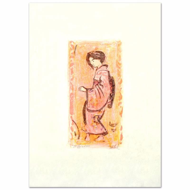 "Ume" is a limited edition lithograph on rice paper, numbered and hand signed by Edna Hibel (1917-2014). Includes Certificate of Authenticity! Measures approx. 12.5" x 18" (with border), 5" x 10" (image). Retail Price $490.00. PRICE INCUDES FREE SHIPPING IN THE U.S. - SHIPPING WILL BE ADDED TO YOUR INVOICE FOR ALL BUYERS OUTSIDE OF THE U.S.