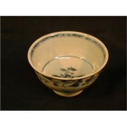Un bol, l'intérieur décoré d'une fleur à quatre pétales, le corps extérieur orné d'une frise de feuilles et de fleurs au-dessus de feuilles de lotus. A bowl, the well decorated with a four-petal flower, the outside with a foliate and floral band above a frieze of lotus leaves. $150/200