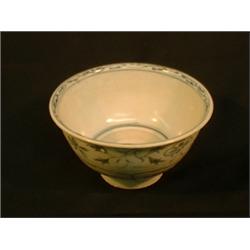 Un bol, l'intérieur portant le caractère: "Phuc" (richesse), l'extérieur à décor de bandeau feuillu et floral au-dessus de feuilles de lotus. A bowl, the inside bearing the character: "Phuc", (wealth), the outside with a floral and foliate band above lotus leaves. $150/200