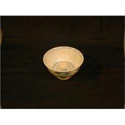 Un bol, l'intérieur portant le caractère: "Phuc", (richesse), l'extérieur orné d'un bandeau de fleurs et de feuilles au-dessus de motifs lotiformes. A bowl, the inside with the character "Phuc", (wealth), the outside with a floral and foliate band above a lotus leaf frieze. $150/200
