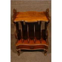 Un "canterbury" victorien en palissandre, les montants ajourés en forme de lyre reposant sur une base chantournée renfermant un tiroir, sur des petits pieds cambrés. A Victorian rosewood canterbury with lyre shaped openwork supports resting on a shaped base containing a drawer, on short cabriole legs. $600/800