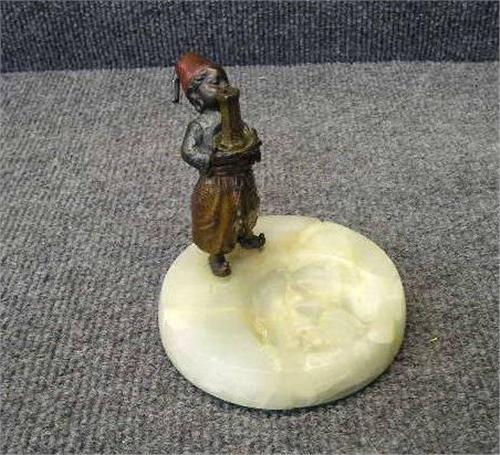 A cold painted Vienna bronze figure of a young Sudanese holding a perfume burner, on an alabaster ashtray.