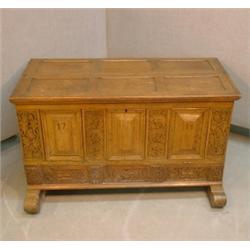 Un coffre ancien en chêne, la façade sculptée de feuillage, l'intérieur transformé en bar. An antique oak chest with a hinged top and front carved with foliate panels, the interior fitted as a bar. H./H. 26 1/4" - 67cm. L./W. 45" - 1.15M. P./D. 25" - 64cm. $1500/2000