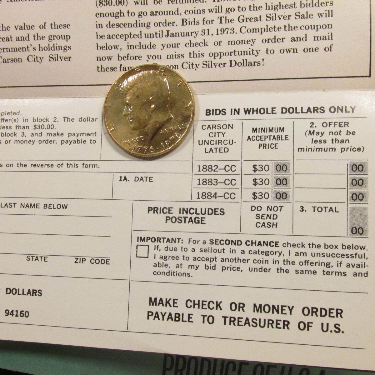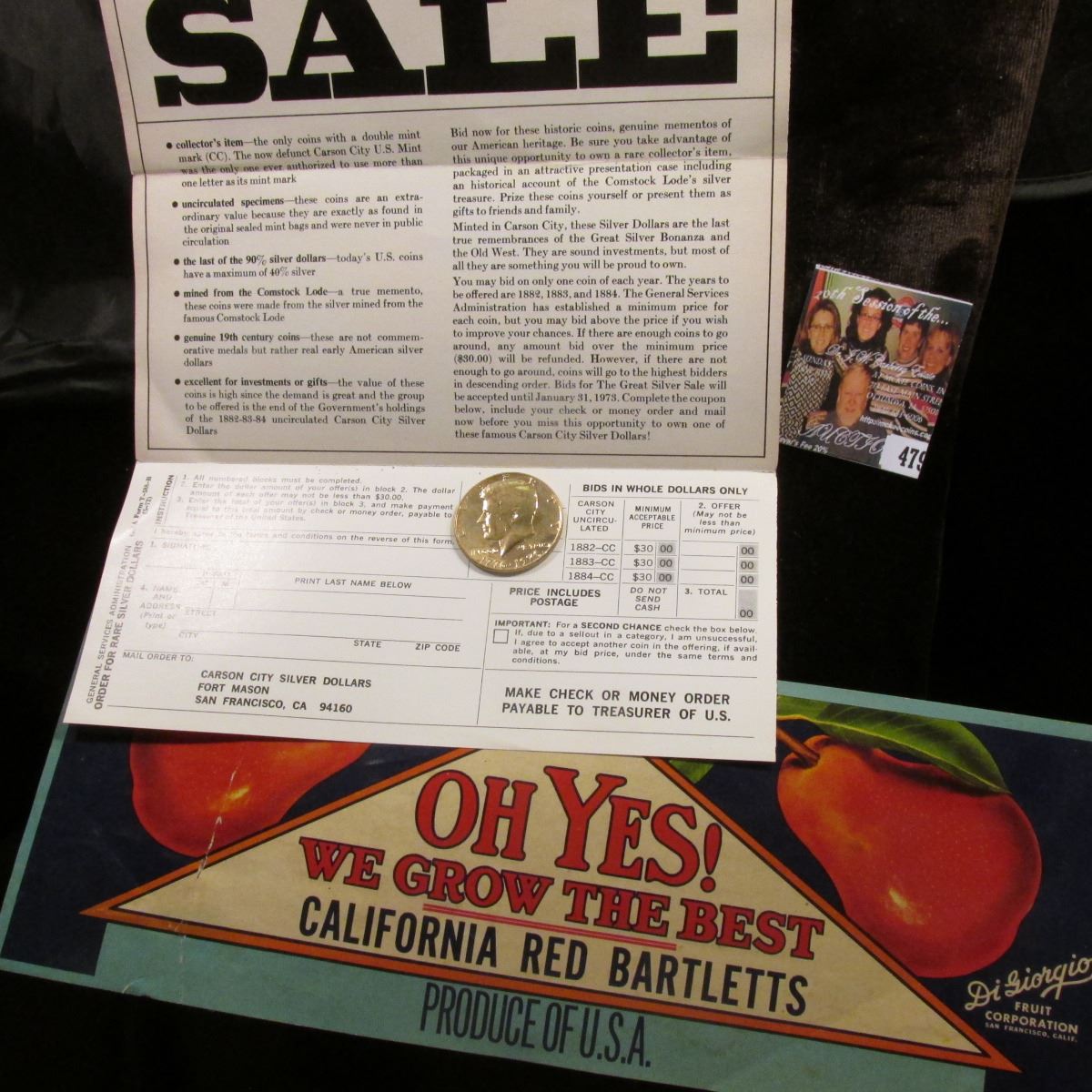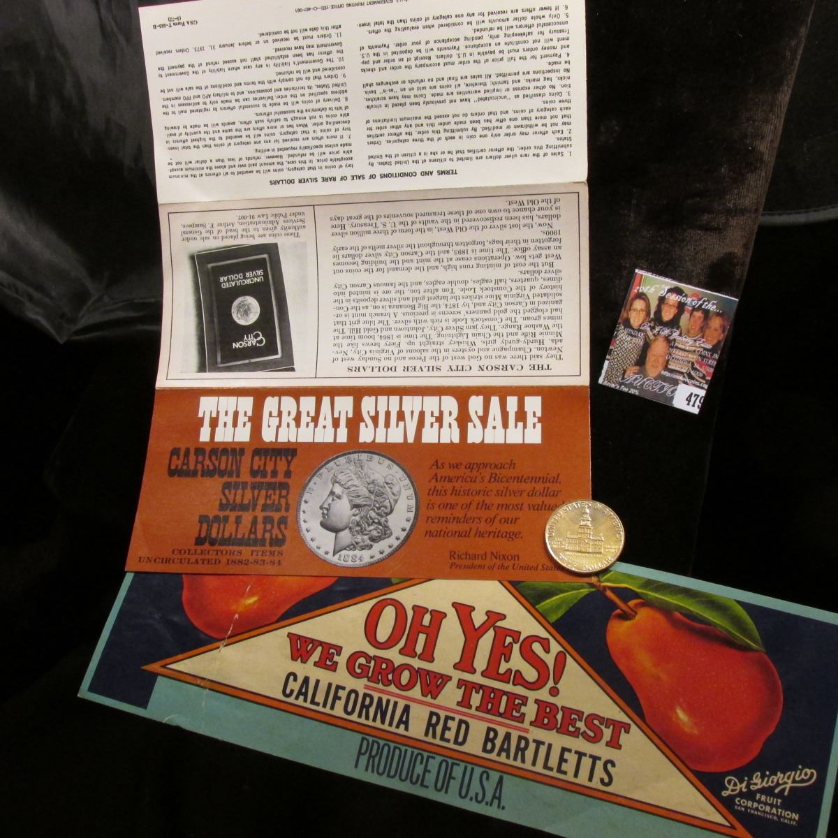 Un-cut Three Note Sheet "Walkill Stump and Land Clearing District…Pay to the Bearer at the Florida National Bank of the City of Jacksonville, State of Florida, or the National City Bank Bank, of the City of New York, State of New York, Fifteen Dollars ($15.00) in Gold Coin of the United States of America...on the First Day of April, A.D. 1921...". Serial No. 561; "The Great Silver Sale Carson City Silver Dollars…Richard Nixon"Brochure"; fruit crate label "Oh Yes! We Grow the Best California Red Bartletts Produce of U.S.A. Di Giorgio Fruit Corporation"; & 1776-1976 P Gold-plated Kennedy Half-Dollar.