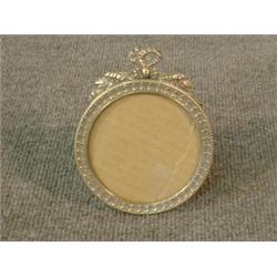 Un encadrement de photo de style Louis XVI circulaire en métal argenté. A Louis XVI style plated silver circular photo frame. Dia./Dia. 4 1/2" - 11cm. $100/150