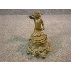 Un encrier en bronze patiné, la base en forme de plume et de griffe d'aigle supportant un encrier...