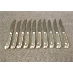 Un ensemble de 10 couteaux à steak en argent de Birks, modèle George II....