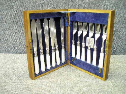 A set of 6 Mappin & Webb plated silver fish forks and knives, with mother of pearl handles, cased.