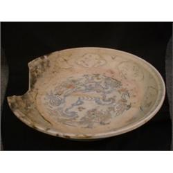 Un grand plat ciculaire à décor bleu et émaillé orné d'un animal mythique dans un encadrement de nuages, le rebord orné de médaillons fleuris, (manque, restauration, usure à l'engobe). A large underglazed blue and enamelled charger decorated with a mythical beast surrounded by clouds, the rim with shaped floral medallions, (loss, restoration, wear to the glaze). Dia./Dia. 17 1/2" - 44cm. $400/600