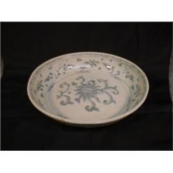 Un grand plat creux à décor de fleur de lotus entourée de branchages dans un encadrement de nuages bordé d'une frise de feuilles et de fleurs. A deep charger decorated with a blooming lotus and scrolling leaves surrounded by clouds and a band of leaves and flowers. Dia./Dia. 13 1/4" 34cm. $450/650