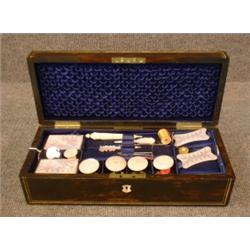Un nécéssaire à couture en nacre dans un écrin en ébène de Macassar à filets d'ivoire, signé: "Lund, Cornhill & Fleet St., London". A mother of pearl sewing kit in an ivory banded Macassar ebony case, signed: "Lund, Cornhill & Fleet St., London". $250/350