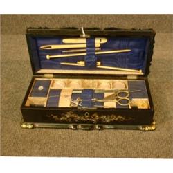 Un nécéssaire à couture victorien en ivoire et nacre dans un coffret en papier mâché incrusté de nacre et peint de fleurs polychromes. A Victorian mother of pearl and ivory sewing kit in a mother of pearl inlaid black papier mache casket painted with polychromed flowers. $200/300