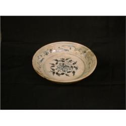 Un plat creux à décor de pivoine dans un couronne de feuillage, bordé d'une frise de fleurs et de feuilles. A deep dish decorated with a peony within a foliate garland, the rim decorated with flowers and foliage. Dia./Dia. 9 1/4" - 23.5cm. $175/250