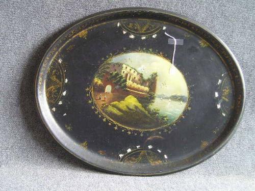 A 19th Century papier mache oval tray, painted with a figural lakeview scene, gilt foliage, and mother of pearl insets on a black ground, (slight losses to reverse). 23" x 29" - 58cms x 74cms.