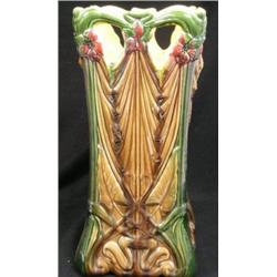 An Art Nouveau faïence square brown and green umbrella stand decorated with flowers holding draperies. H./H. 22 1/2" – 57cms.