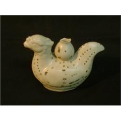 Un récipient moulé en forme d'oiseau supportant une gourde, à décor émaillé de touches vertes, (é...