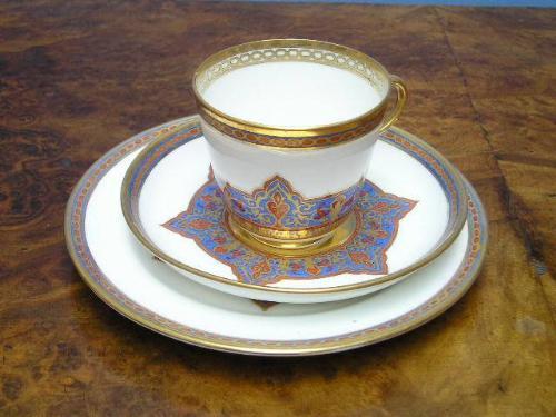 A Davenport-Longport porcelain coffee set, circa 1870, with a pink, blue and gilt Middle Eastern decoration on a white ground, consisting of 12 coffee cups and saucers, 12 dessert plates, a cake plate and a slop bowl, (38).