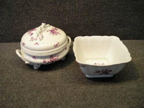 A 67-piece German porcelain dinner set with purple roses on a white ground, consisting of 12 soup plates, 21 dinner plates (4 slightly chipped), 11 salad plates (6 slightly chipped), 11 bread and butter plates (6 slightly chipped), a covered soup tureen