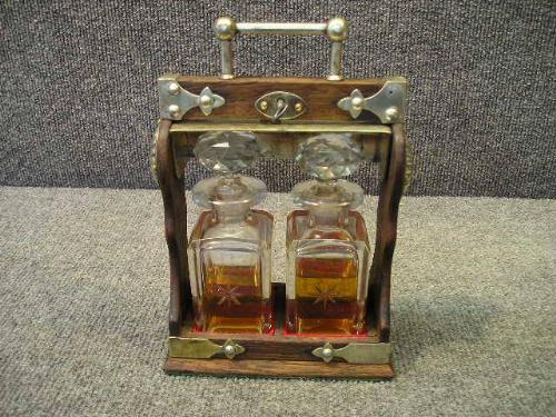 A miniature plated silver mounted oak tantalus with two cut crystal decanters.