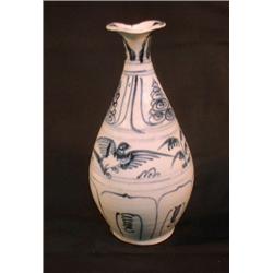 Un vase cornet décoré de deux oiseaux aux ailes déployées séparés par des bambous, les parties supérieures et inférieures ornées de motifs concentriques et de nuages, le col à décor de feuilles, (éclats aur rebord). Note: Des vases de ce type ont été découverts dans des fouilles à Chu Dao, province de Hai Duong. A trumpet shaped bottle decorated with two birds with outstretched wings separated by bamboos, the upper part with circular motifs, the lower part with clouds, the neck decorated with leaves, (rim chips). Note: Bottles of this type have been excavated in Chu Dao, Hai Duong province. Lit: Tang Ba Hoanh et al, 1999 (2e ed.): Gom Chu Dao, Chu Dao ceramics, Kinh Books Ltd., p. 133. H./H. 12 1/4" - 31cm. $450/650