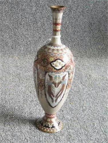 A Chinese cloisonne enamel long necked vase decorated with fabulous animals and flowers on a grey ground.