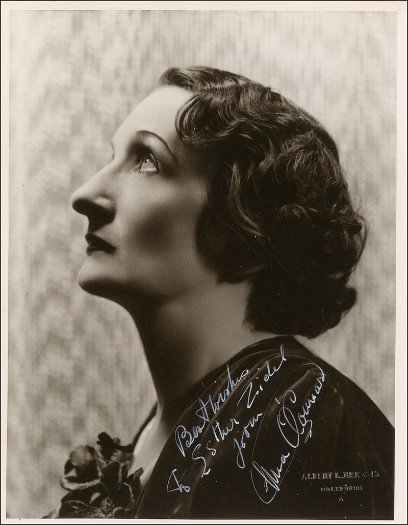 Memorable Irish character actress (1880–1959) who appeared in The Invisible Man and The Bride of Frankenstein. Vintage glossy 8 x 10 Bresnik profile portrait, signed and inscribed in white ink “Best wishes To Esther Ziedel from Una O’Connor.” Some light creasing to a couple corners and right edge, otherwise fine condition.