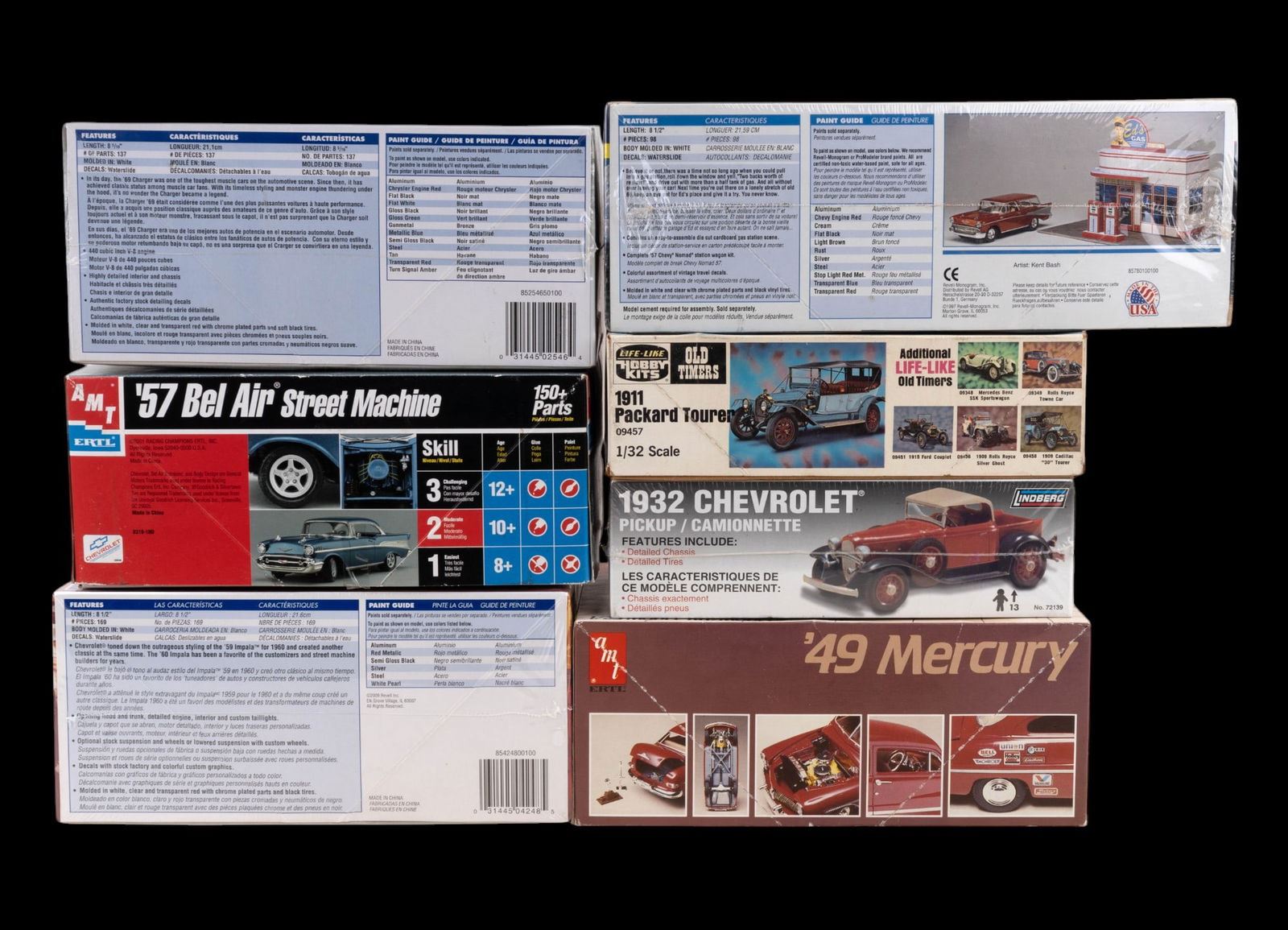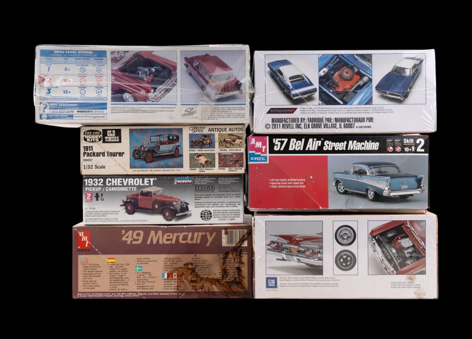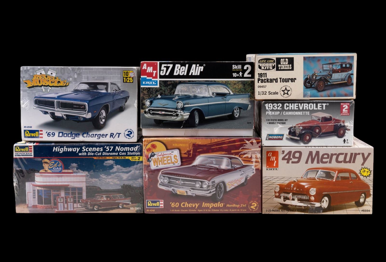 Collection includes: Life-Like Hobby Kits:1911 Packard Tourer 1/32; AMT / ERTL: '57 Bel Air 1/25, '49 Mercury 1/25; Revel: '60 Chevy Impala 1/25, '69 Dodge Charger R/T 1/25, Highway Scenes '57 Nomad with gas station 1/24, and more.