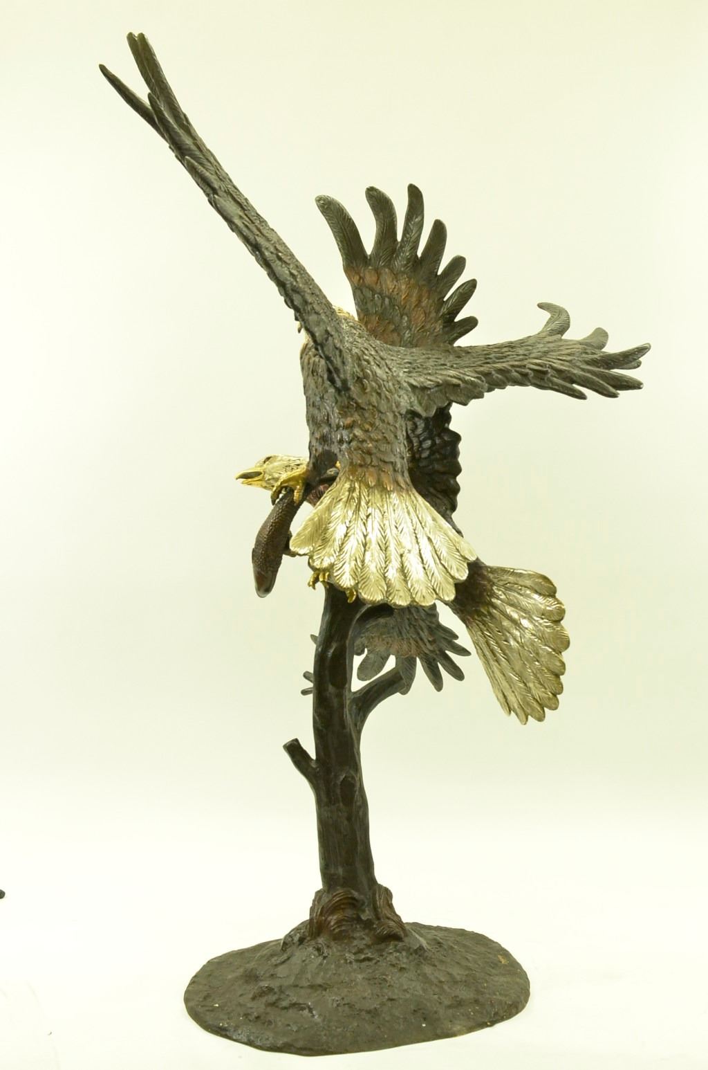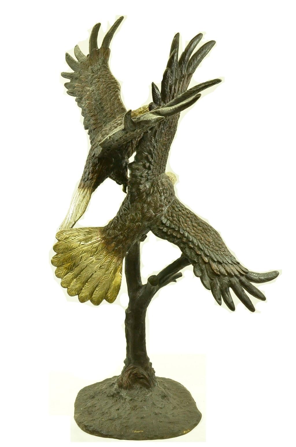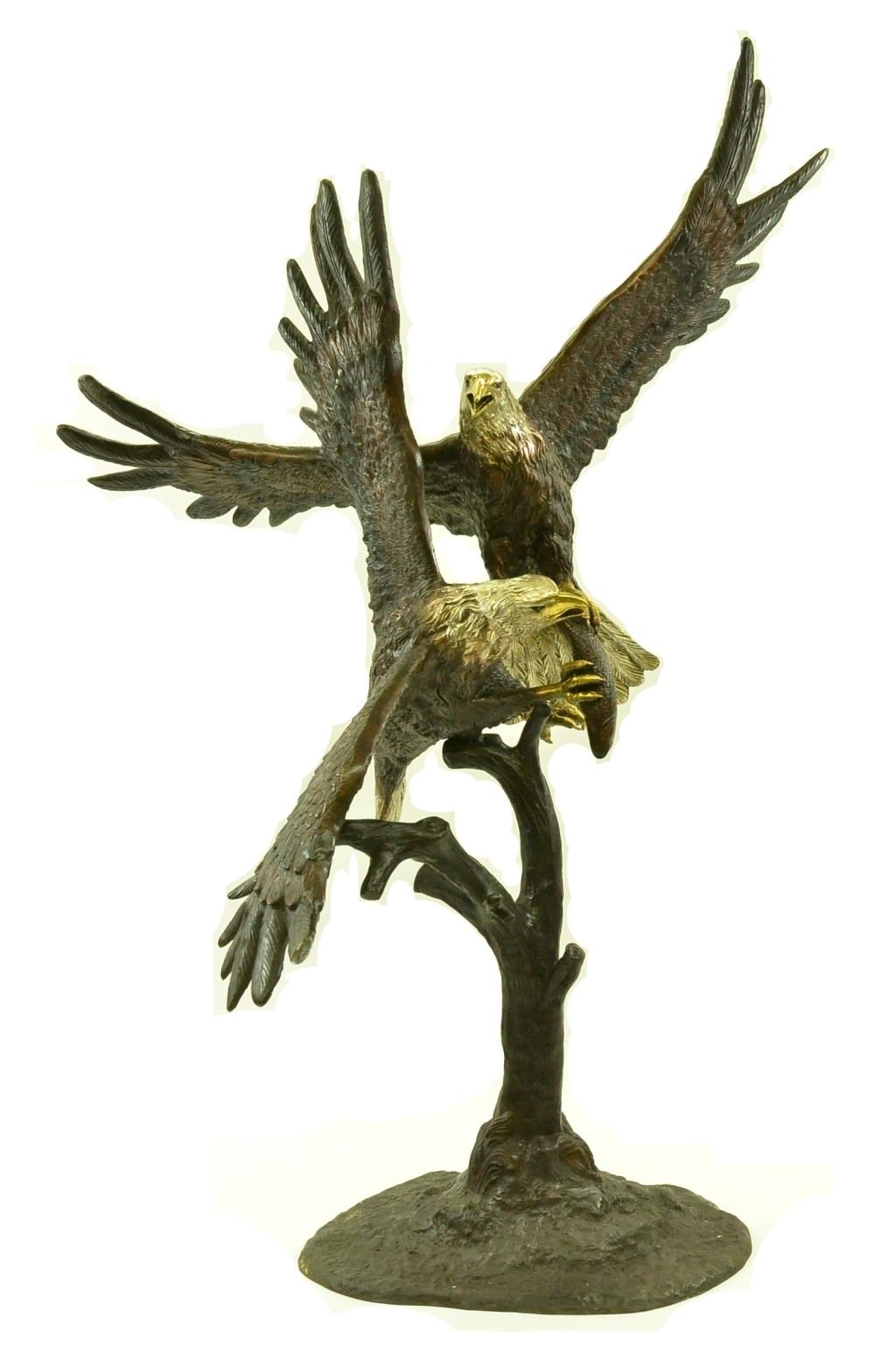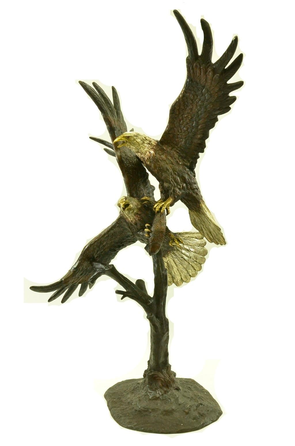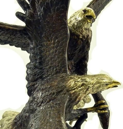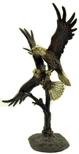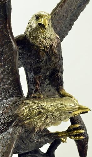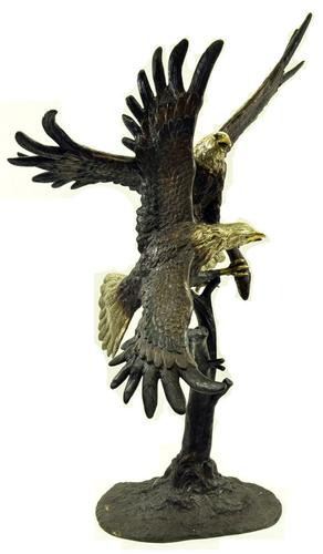 This is a magnificent sculpture and the detail is just incredible. This is actually two eagles fighting. The beaks and talons are all done in a very highly polished bronze. This is one of our most popular wildlife sculptures. It is handmade and cast in the traditional Lost Wax Casting Process. This insures a quality bronze sculpture that may be passed down from generation to generation. This is a good piece for outdoor gardens, an entry way, or a great room. This bronze statue measures 74 inches high by 60 inches long. Weight: 200 LBS.