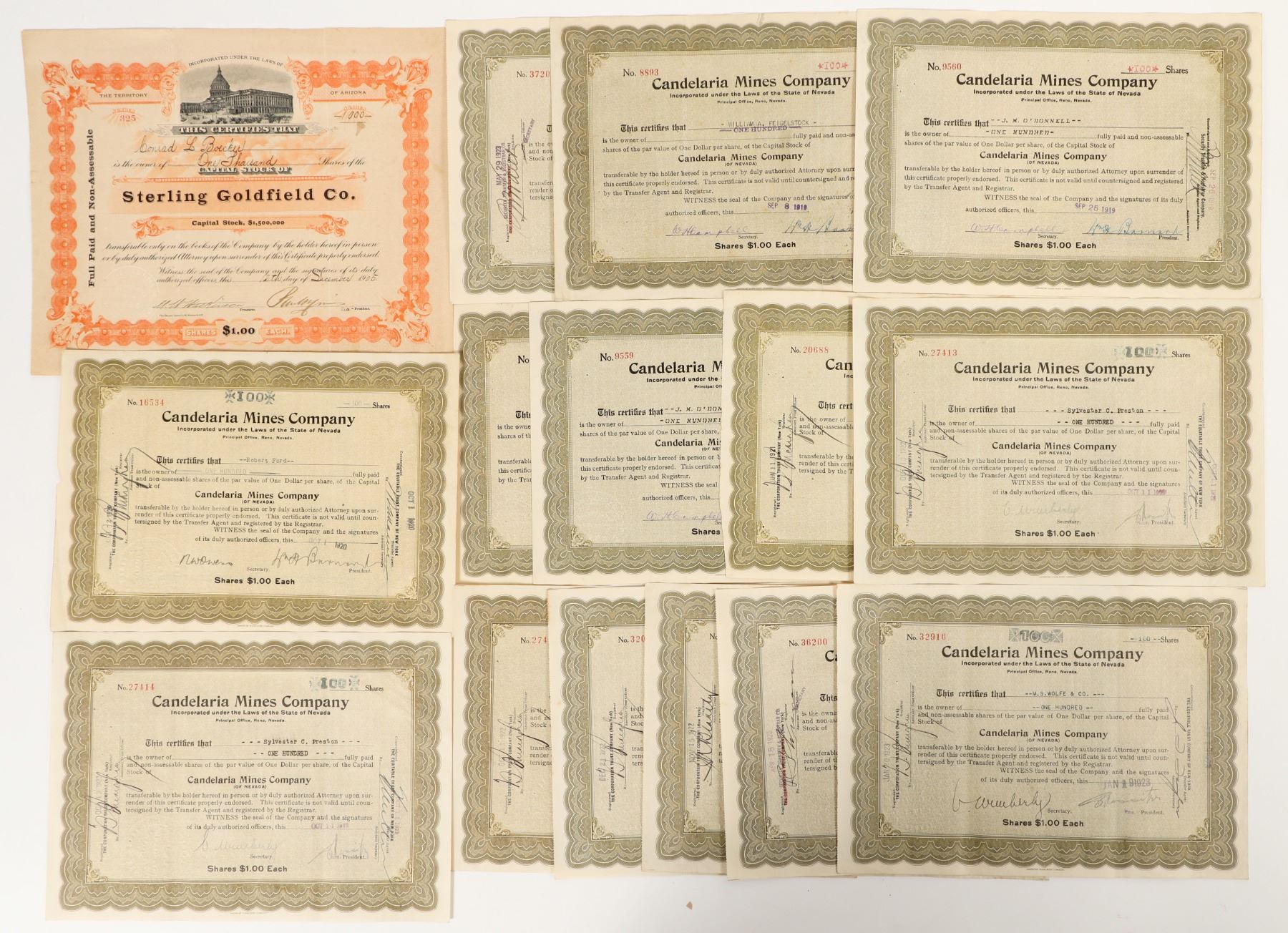 Uncancelled Candelaria Mining Company stocks, about 15. Candelaria MC once operated a major open pit silver mine in Esmeralda County, Nevada. About 6 stocks issued for 1000 shares, about 10 stocks issued for 100 stocks. Includes one Sterling Goldfield Co stock for 1000 shares, with capitol building pictorial. Overall good condition. See photo.