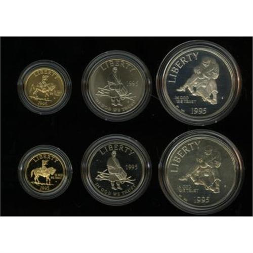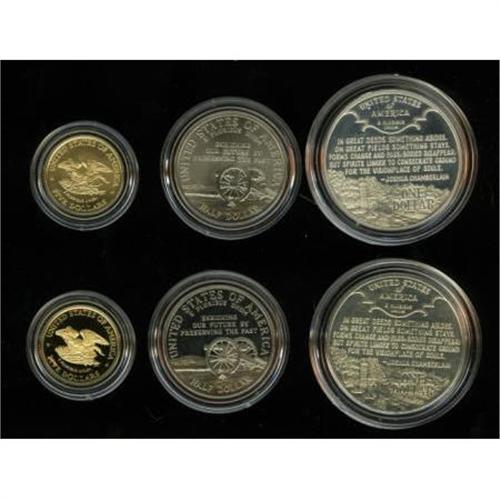 <B>Uncertified 1995 Civil War Battlefields Set.</B></I> The set contains the 1995-W gold five dollar in Uncirculated and Proof; the 1995-S clad half dollar in Uncirculated and Proof; the Uncirculated 1995-P silver dollar; and the proof 1995-S silver dollar. The box of issue and certificate of authenticity are included. All coins are essentially as issued.<BR><BR><b>Shipping:</b> Coins & Currency (<a target="_blank" href="http://www.heritageauctions.com/common/shipping.php">view shipping information</a>)