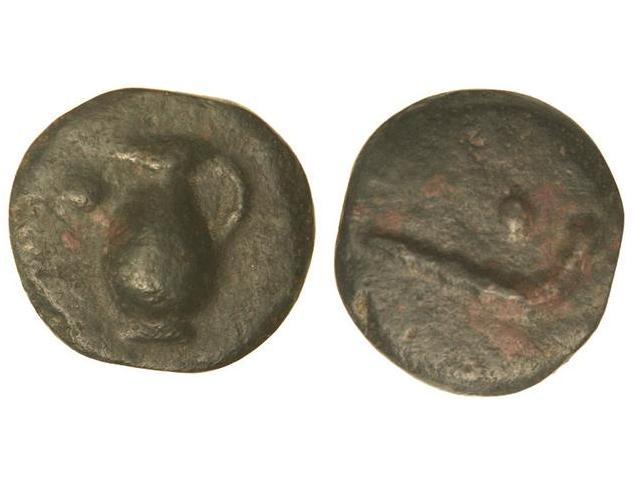 Uncia. 280-260 a.C. ANÓNIMO. ITALIA CENTRAL. LATIUM. CAMPANIA. Anv.: Cántaro a izquierda, delante punto. Rev.: Podum (sistrum). Punto. 29 grs. Pátina oscura. T&V-223. EBC.