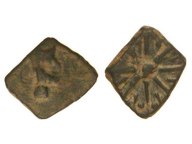 Uncia. MALACA. Anv.: Cabeza con gorro egipcio y coleta a derecha. Rev.: Estrella de dieciséis rayos. 1,20 grs. Variante de G.G.-111 por cabeza más pequeña. Pátina verde. Cospel cuadrado. AB-No cat.; G.G.-112 mismo ejemplar. MBC+.</
