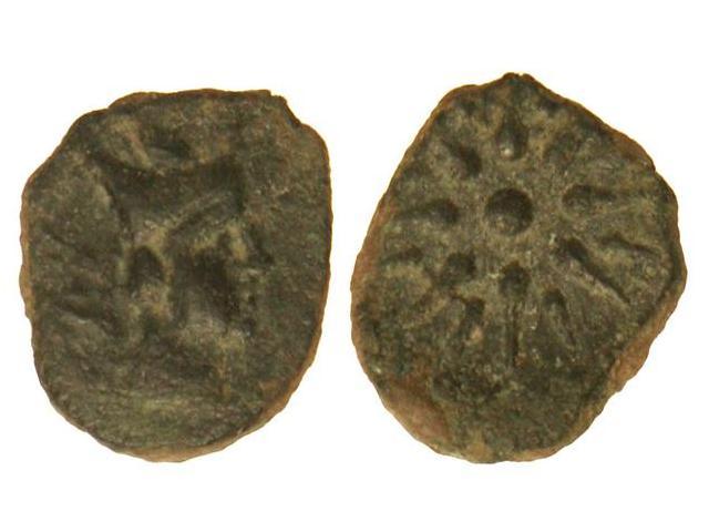 Uncia. MALACA. Anv.: Cabeza con gorro mitral, con moño y coleta a derecha. Rev.: Estrella de dieciséis rayos. 1,70 grs. Pátina verde oscura. AB-No cat.; G.G.-113 sim. EBC-.