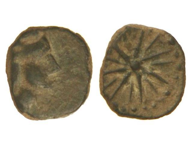 Uncia. MALACA. Anv.: Cabeza con gorro mitral, moño y coleta a derecha. Rev.: Estrella de dieciséis rayos. 1,30 grs. Variante de G.G.-113 por mitra más esquemátca. Pátina verde oscura. AB-NO cat.; G.G.-114. MBC+.