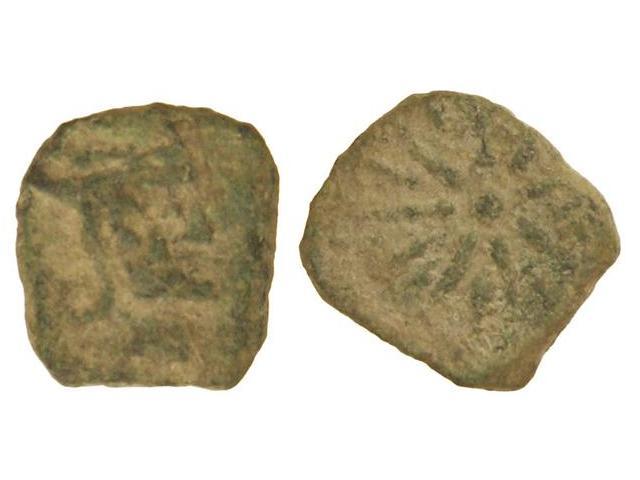 Uncia. MALACA. Anv.: Cabeza con gorro mitral, moño y coleta a derecha. Rev.: Estrella de dieciséis rayos. 1,40 grs. Variante de G.G.-113 por mitra más esquemática. Pátina verde. AB-No cat.; G.G.-114. MBC-.